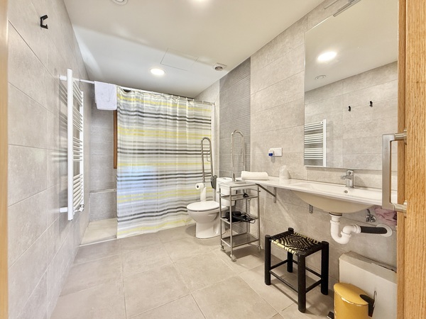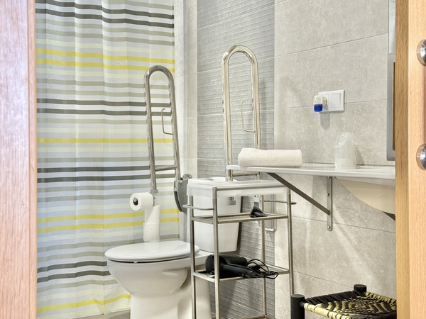 El baño está equipado para personas con movilidad reducida, con ducha a cota cero, asiento, barras de apoyo o espacio de giro que ofrece óptima movilidad, entre otros detalles.