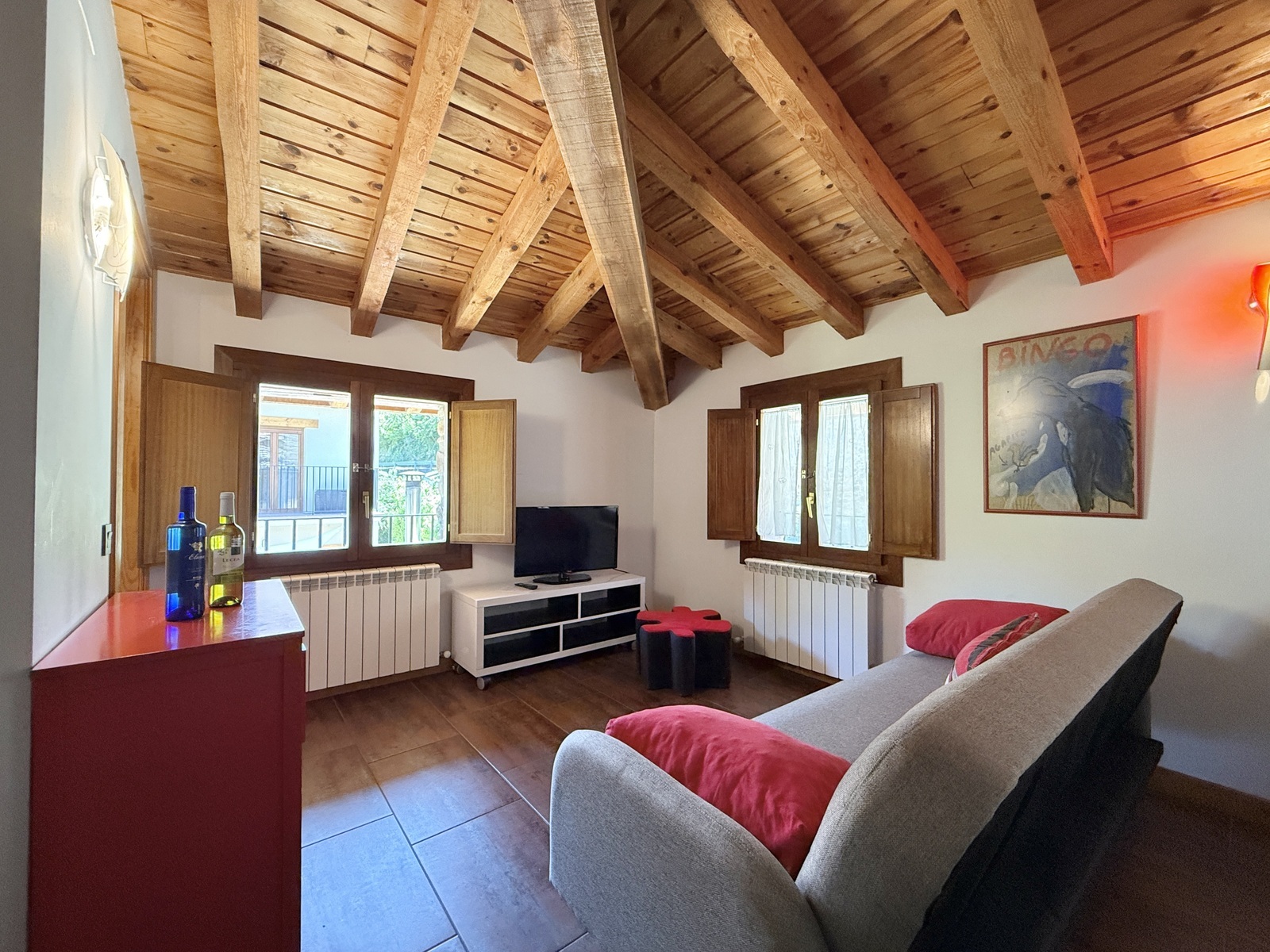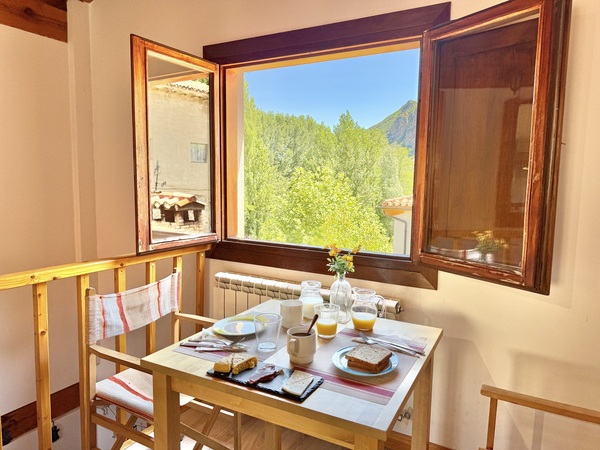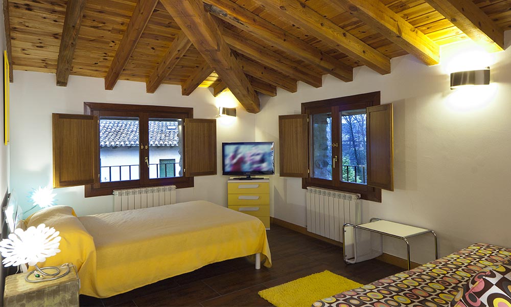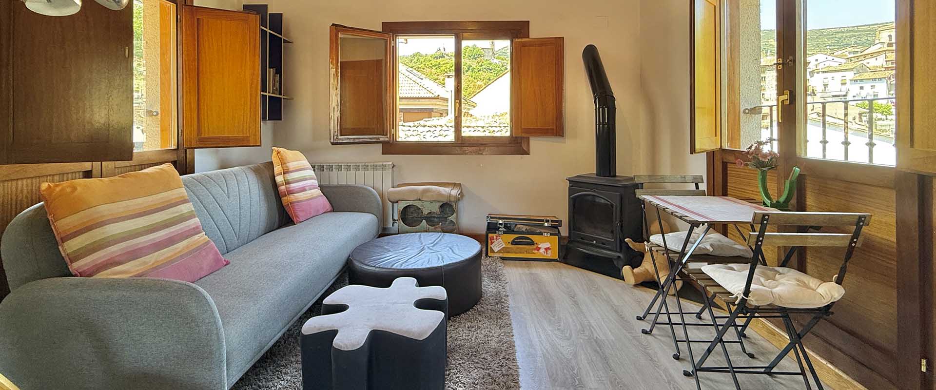 In La Rioja, we refer to the “solana”, solarium, as a reading room, a place to listen to music or just unwind. This warm and wood-laden enchanting space, looks out on the marvelous views of the Serradero Mountain and the town of Torrecilla en Cameros. A French stove warms the evenings after our traditional lovely sunsets.